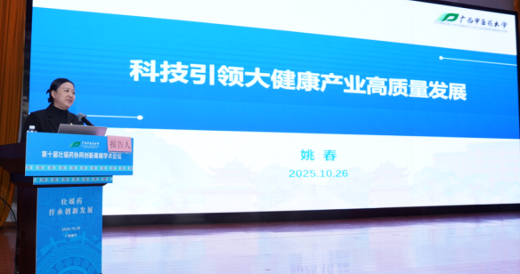 姚春在论坛主会场作了题为《科技引领大健康产业高质量发展》的主旨演讲。她从大健康产业发展的机遇、广西中医药资源情况和大健康产业发展的思考与策略三个方面,系统梳理了大健康产业的时代机遇,介绍了广西在区位生态、康养旅游、药材资源、香精香料及药食同源品种等方面的天然优势,并重点展示了鸭脖在人才集聚、科技研发、医疗服务与国际合作等方面形成的核心竞争力,为推动产业发展奠定了坚实的信心基础。姚春提出的一系列策略极具战略价值,规划了以科技引领、涵盖诊疗能力提升、制剂开发、智能化建设、国际化推广及中国—东盟合作的清晰实施路径。整场报告高屋建瓴、内容翔实,兼具理论高度与实践价值,为推动壮瑶医药协同创新与产业高质量发展提供了重要指引。