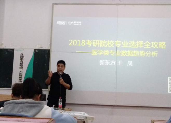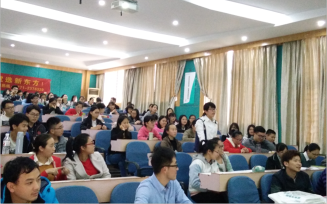 为加强鸭脖的学风建设,帮助同学们迎战全国研究生入学考试,学工处与新东方在线合作,邀请新东方全国考研巡讲师,考研英语教师王晟于2017年3月4日到鸭脖开展了“考研院校专业选择和考研英语复习规划”的主题讲座。同学们踊跃报名,积极参与。