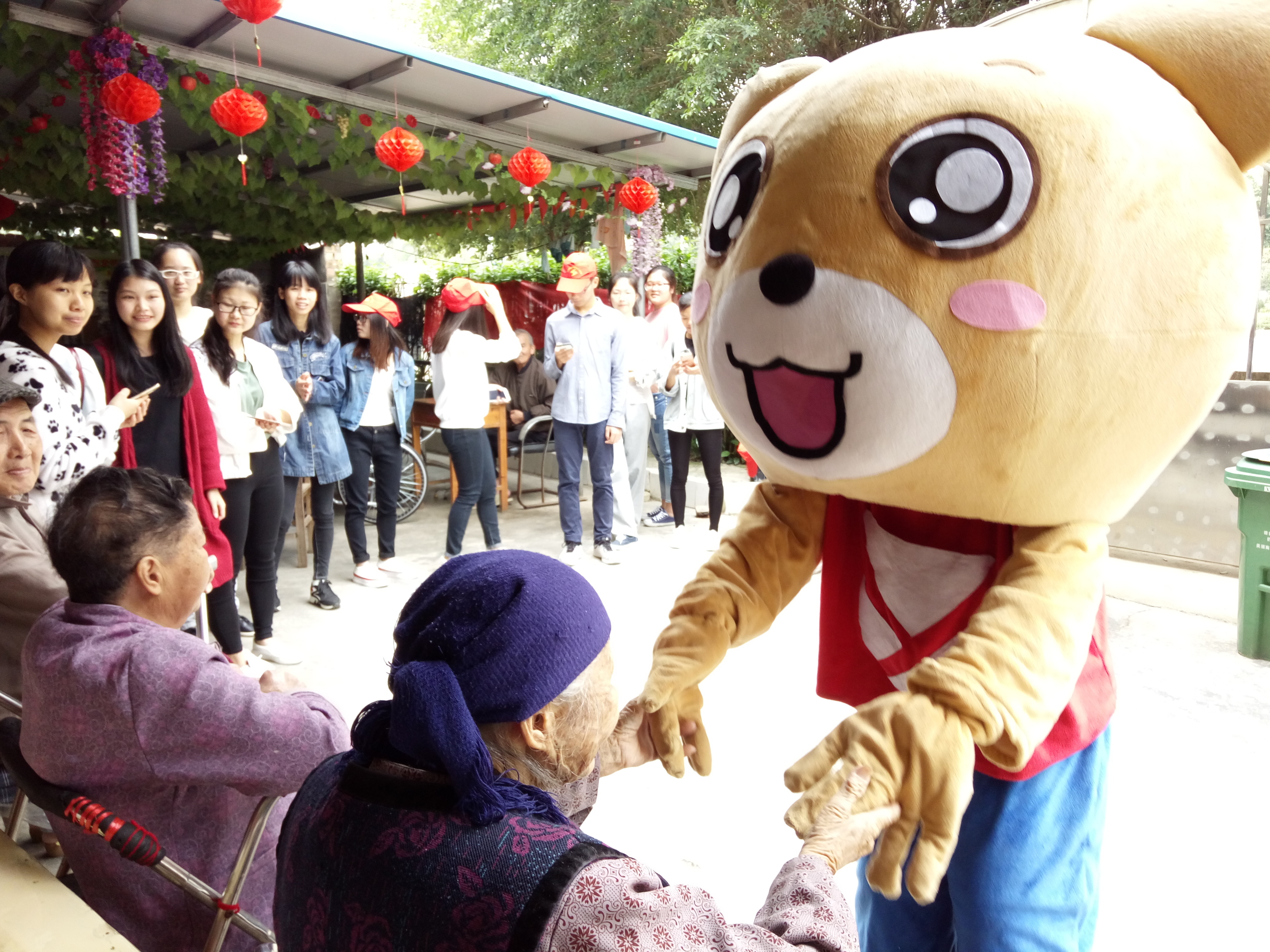 尔后,易班小熊的出现将志愿活动推到了高潮,各老年人对易班小熊的出场表示惊奇与好奇,活泼的易班小熊与志愿者们共同为老年人演唱了《歌唱祖国》《红旗飘飘》等歌曲,并与各老年人握手拥抱。整个活动过程中洋溢着欢声笑语,为老年人传送出家庭的温暖。活动的最后,各志愿者怀着不舍的心情和老人道别并在青秀区惠民护老院的门口合影留念。