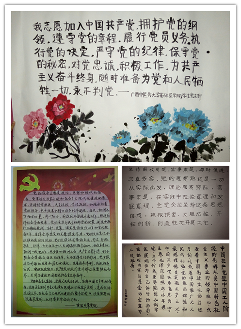 本次活动在线下和线上易班“党建易家”平台同时进行,要求全体党员预备党员以及党支部委员自行选取党章中的一部分内容,采用书法和美术创作及有创意的书写方式进行摘抄,之后将优秀作品发布易班供大家共同欣赏并进行评论互动。本次活动首次采用与线上易班相结合的方式,增多了大家的参与方式、扩大了本次活动的影响力,让更多的同学参与到党章的学习中来。用这样别开生面的方式号召大家积极参与到学习党的知识中来,既不刻板、又不失严肃活泼,此次活动一经开展便得到大家的大力支持。在收集上来的作品中,有圆匀秀美的隶书、规矩整齐的楷书......一点一横、一撇一捺勾画着认真和严肃。有参赛者坦言道,如果不是参加本次活动让他们有机会慢慢地“读”党章并对党有了新的认识,他们对党的了解还只是停留在表面。随后基础医学院学办老师对本次活动上交的作品进行评比,最终评选出了十来份优秀作品。接着由支部委员把优秀作品投放易班进行展示,获得了良好反响,大家在相互欣赏艺术的同时加强了对党章的学习。本次活动取得圆满成功,可是我们对党的知识的学习永远不会停止。