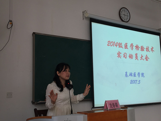 为确保基础医学院2014级医学检验技术专业毕业实习工作顺利进行,让同学们以积极正确的心态投入实习学习工作,2017年5月17日上午,基础医学院在仙葫校区1-204为2014级医学检验技术专业召开毕业前实习前动员大会。基础医学院党委副书记龙春莉老师为2014级医学检验技术专业共57名学生做了专题指导。大会由2014级医学检验技术班辅导员杨丽琴老师主持。动员会上,龙春莉副书记希望每一位同学珍惜此次实习机会,牢记“弘毅自强传承创新”的校训精神,在实习过程中展现YABO鸭脖学子的优秀品质和精神风貌。同时龙书记还提出几点要求:一是遵守制度,认真严谨。要求全体实习生明确实习目的和要求,严格遵守校纪院规,保质保量完成毕业实习任务,不断提高自身综合素质和医学实践能力。二是虚心求教、关爱同学。精湛的医疗技术是一个长期积淀的过程,医学生实习过程中一定要向实习带教老师多请教,多主动承担工作,不断提升自己的技术和工作能力。实习中多主动关心同学,和睦相处,互相互助。三是增强安全意识,安全为重。提醒同学们多注意实习操作过程中的安全防范,此外还要增强自身安全意识,如不要轻信陌生人的话,避免落入传销组织等。