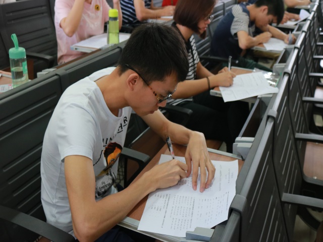 初赛吸引了包括基础医学院、药学院、赛恩斯新医药学院、针灸推拿学院、护理学院、壮医药学院等学院的学生,共668人参加。初赛形式为笔试,同学以个人为单位参赛。题目类型包括:根据汉字写拼音、根据拼音写汉字、根据文意选择词语、繁体字或异体字转化为简体字、补填有关医药成语等。考试内容来自医古文、中药学、方剂学、内经学、伤寒论等多门中医课程,充分、全面考查了同学们对于中医药汉字的理解和认读水平。初赛现场秩序井然,工作人员引导参赛选手入座并分发试卷。考试开始后,考生们低头沉思,奋笔疾书。