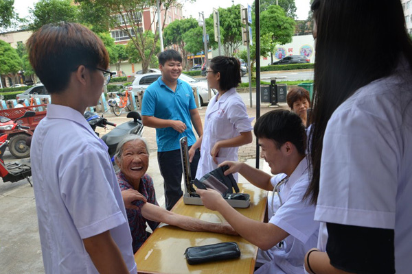 高血压是威胁人类健康的一种慢性病,手法协会的同学们专门携带了血压仪为村民测量血压。同学们在测量血压过程中认真对待每一位前来测量血压的民众,告知他们准确的读数,并倡导他们建立健康的生活行为方式。