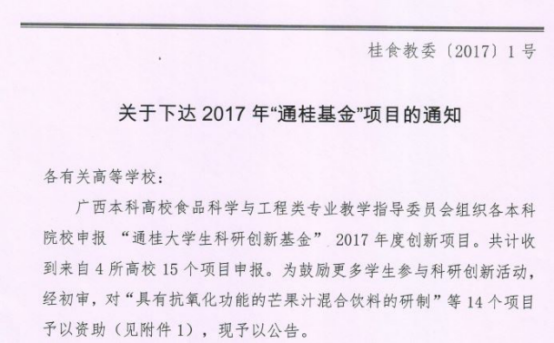 “通桂基金”大学生创新性实验项目申报由广西本科高校食品科学与工程类教学指导委员会(桂食教委)组织,广西通桂农业开发有限公司支持。该项目面向广西本科高校食品类专业学生,对获准立项的项目资助1000~3000元,项目成果可直接参加广西高校食品科学竞赛(区级竞赛)。对于获奖项目,项目成员还能获得相应奖学金。本次申报中,共立项14项,分别来自全区4所高校,其中鸭脖项目5项,占立项总数的35%。