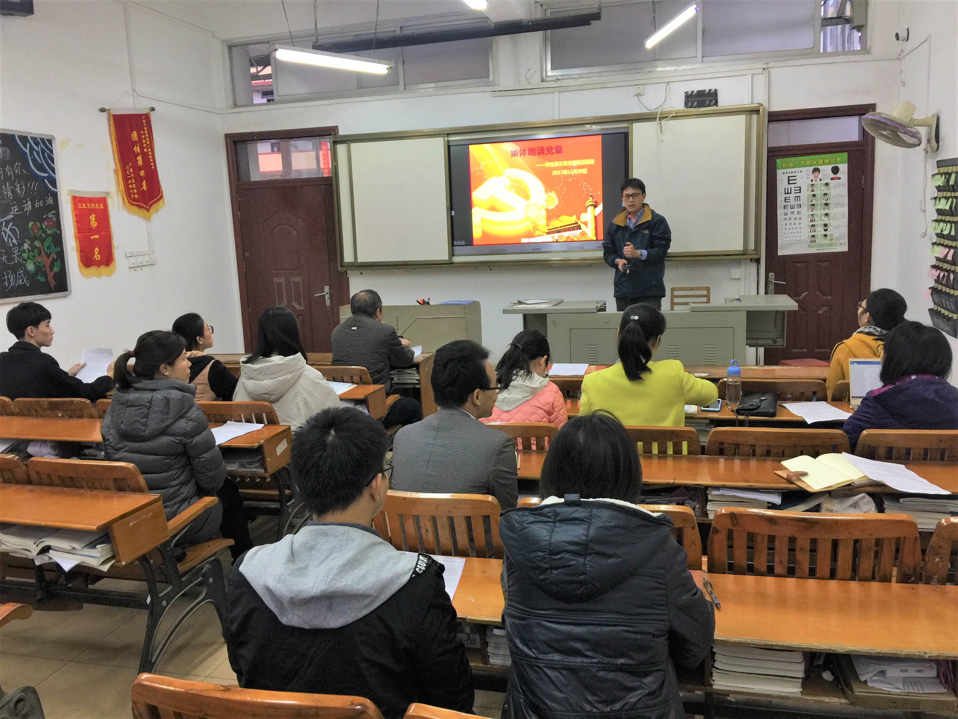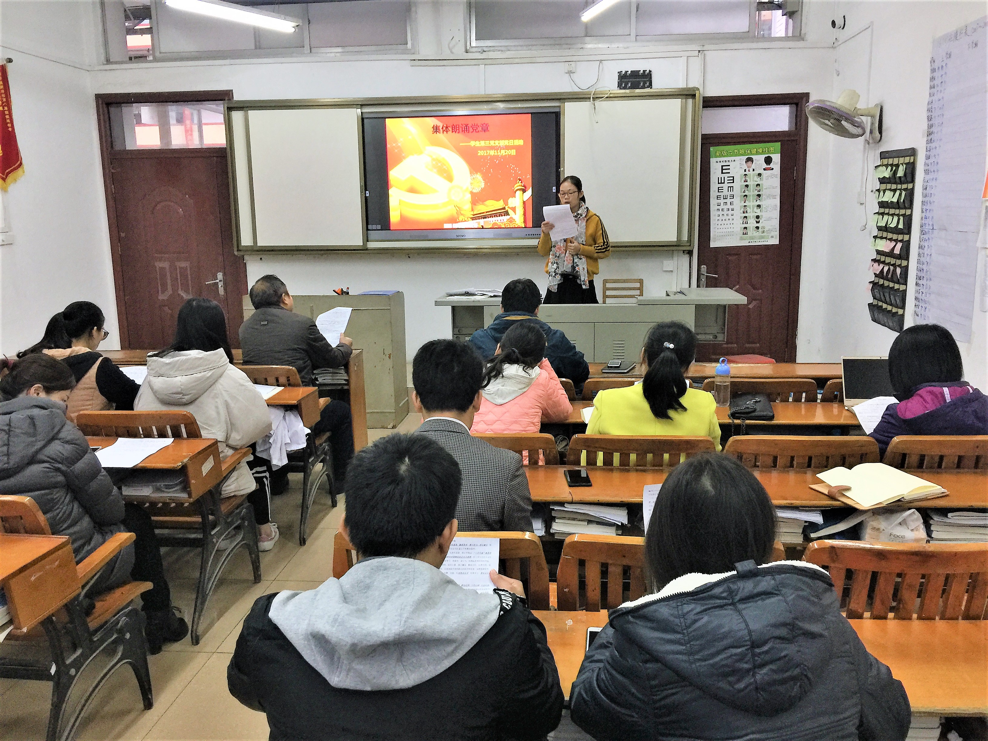 11月20日下午,高职院、附设中医学校党总支学生第三党支部在北湖校区教学楼1-201开展了“诵读党章”的主题党日活动。