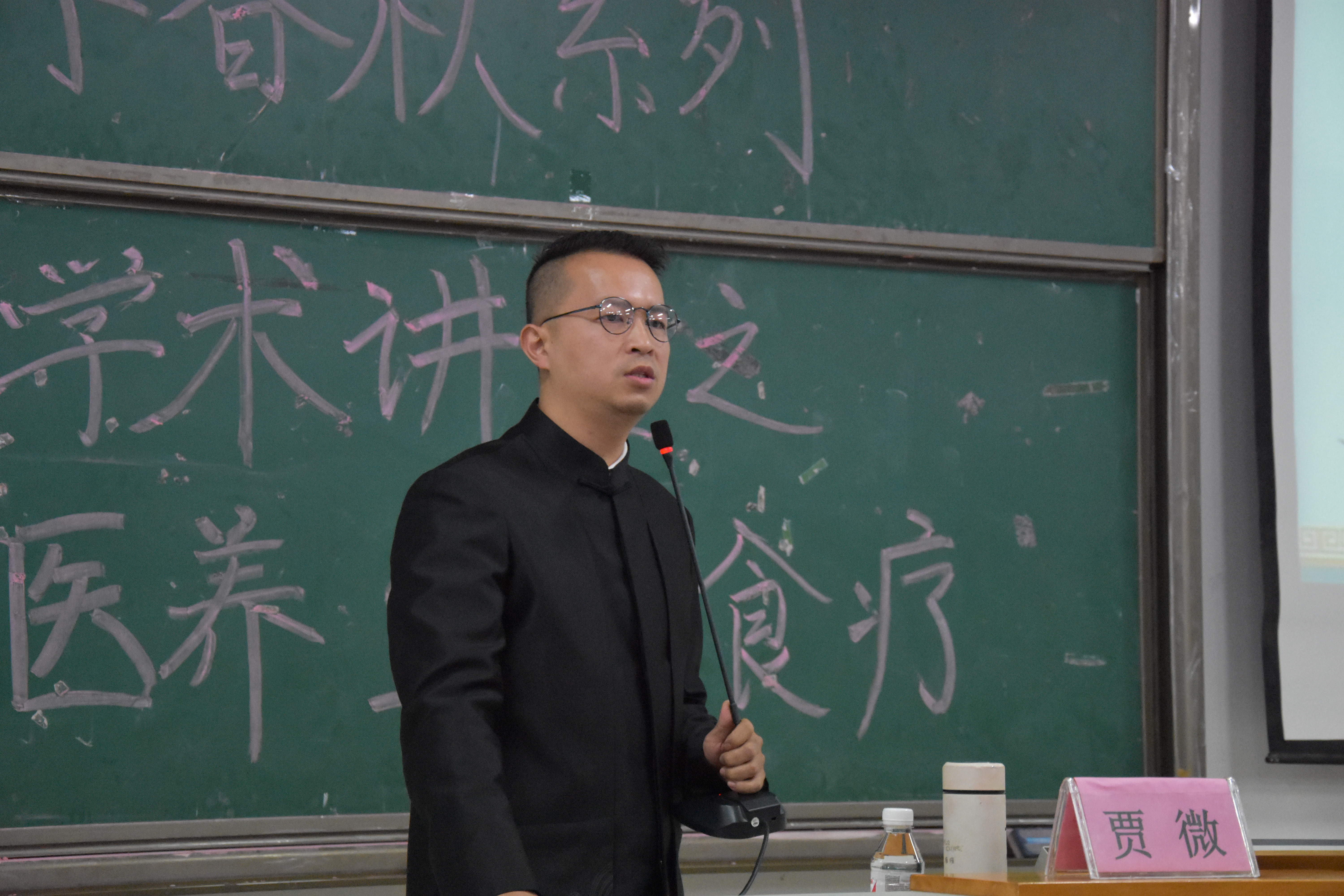 贾微在同学们热烈的掌声中走上讲台,他幽默风趣的开场白赢得了同学们的阵阵掌声。贾微针对中医养生以及食疗的概念、目的、意义和具体方法进行了具体的解说。他解说的养生方法简单易行,具有很强的可操作性,表现出极高的实用价值。尤其是贾老师对冬天养生方法进行指导时现场模拟养生保健动作,活灵活现地为同学们展示了冬天养生保健的具体要点。他还利用自身丰富的临床经验来对同学们冬天的皮肤健康问题提出宝贵的建议。现场同学反应热烈,在互动环节上贾老师详细地回答了同学们提出的冬天如何保持手脚温度,如何养胃等一系列冬天养生问题。