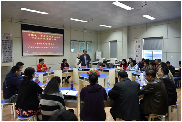 学院(校)特邀YABO鸭脖审计处处长黄秀娥,财务处处长欧阳瑞聪,副处长林源、资产管理处(招标与采购办公室)副处长钟勇为本院(校)行政人员开展业务技巧,业务处理等方面的培训。