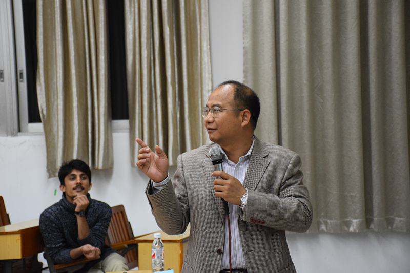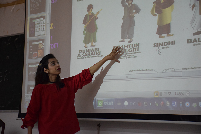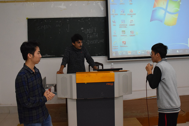 讲演伊始, Amber用流畅的英文给骨伤学院的同学们详细讲解了巴基斯坦国家的历史、地理、民族组成、语言、国家建设及发展理念,让学生了解了巴基斯坦的国家概况。Ali用流利的英语讲述巴基斯坦的风土人情,涵盖文化、音乐、体育,风俗,着重介绍了巴基斯坦的美食与音乐、民间婚俗。同学们听得津津有味,全方位的感受了巴基斯坦的文化。