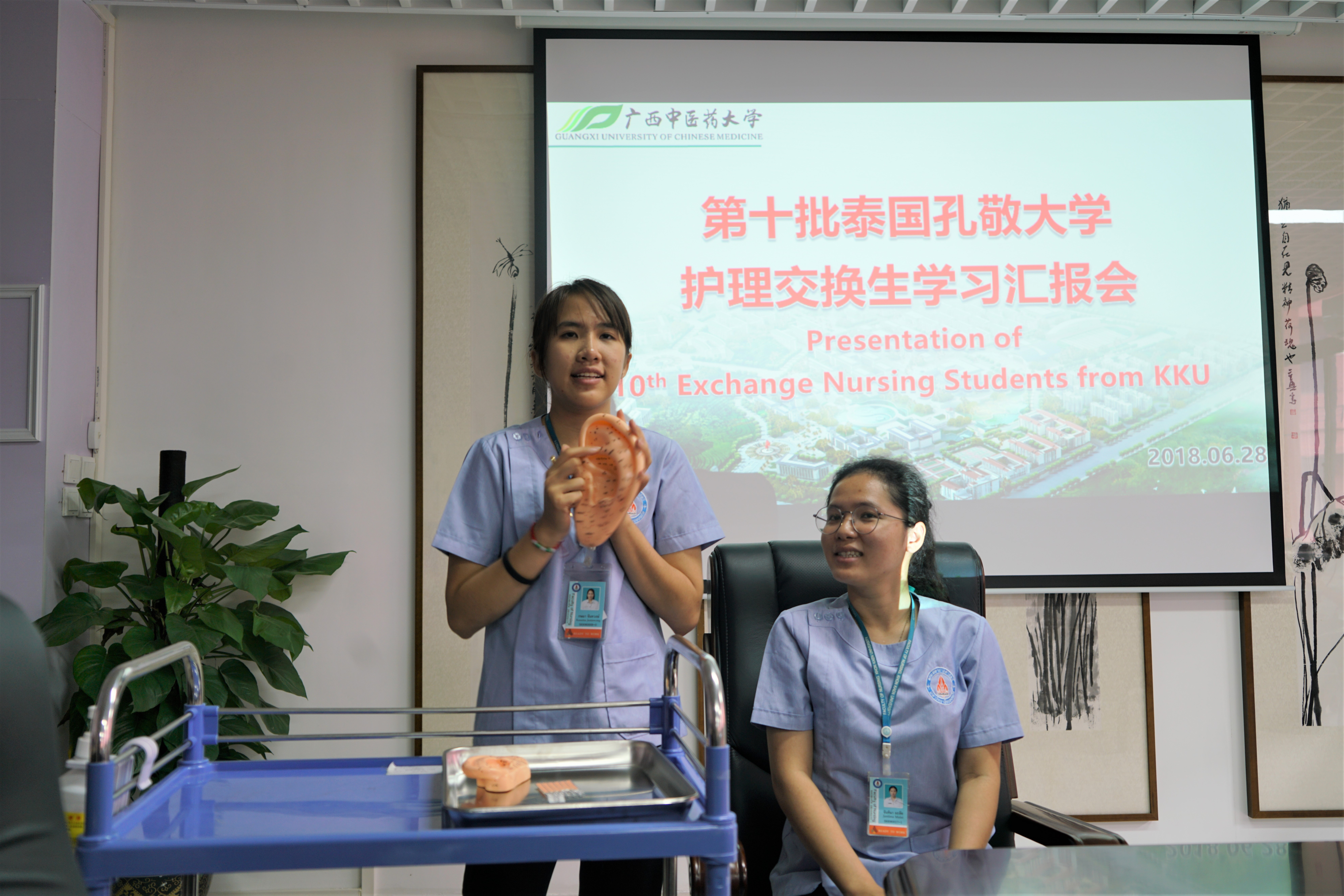 汇报会上,马秋平总结了本次泰国交换生的学习及生活情况。泰国交换生向与会领导、带教老师进行了全面、精彩的学习汇报。她们以临床实习所见的典型案例为主线,介绍了从中医角度如何开展临床护理工作。她们表示学会了很多中医特色的护理技术和护理理念,开拓了专业视野。同时YABO鸭脖第一附属医院、YABO鸭脖瑞康医院、广西重阳城老年公寓带教老师也分别总结了本次带教情况。