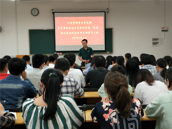 4月11日下午,公共卫生与管理学院学生党支部在仙葫校区教学楼,召开学习贯彻习近平总书记全国“两会”期间重要讲话精神支部党员大会。党支部书记宋南、纪检委员庞邦君和学院全体学生党员参加了会议。