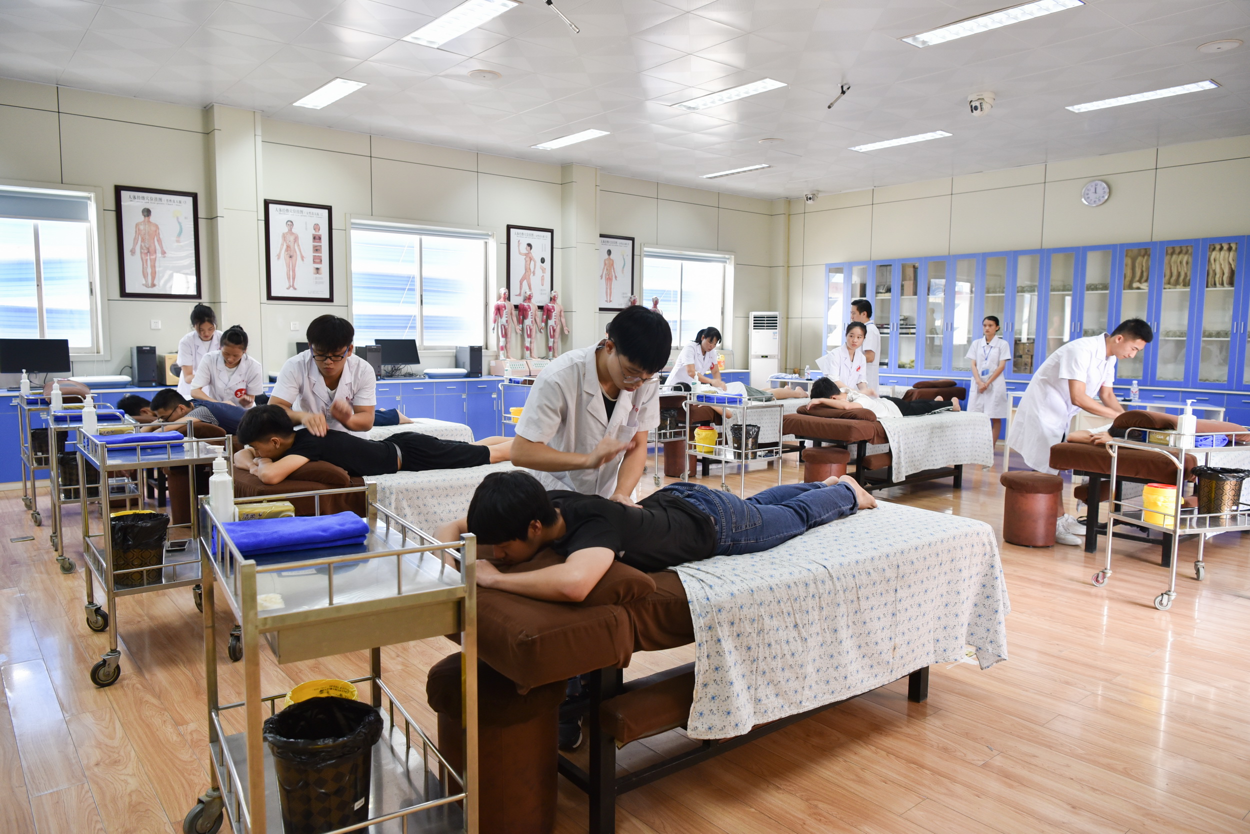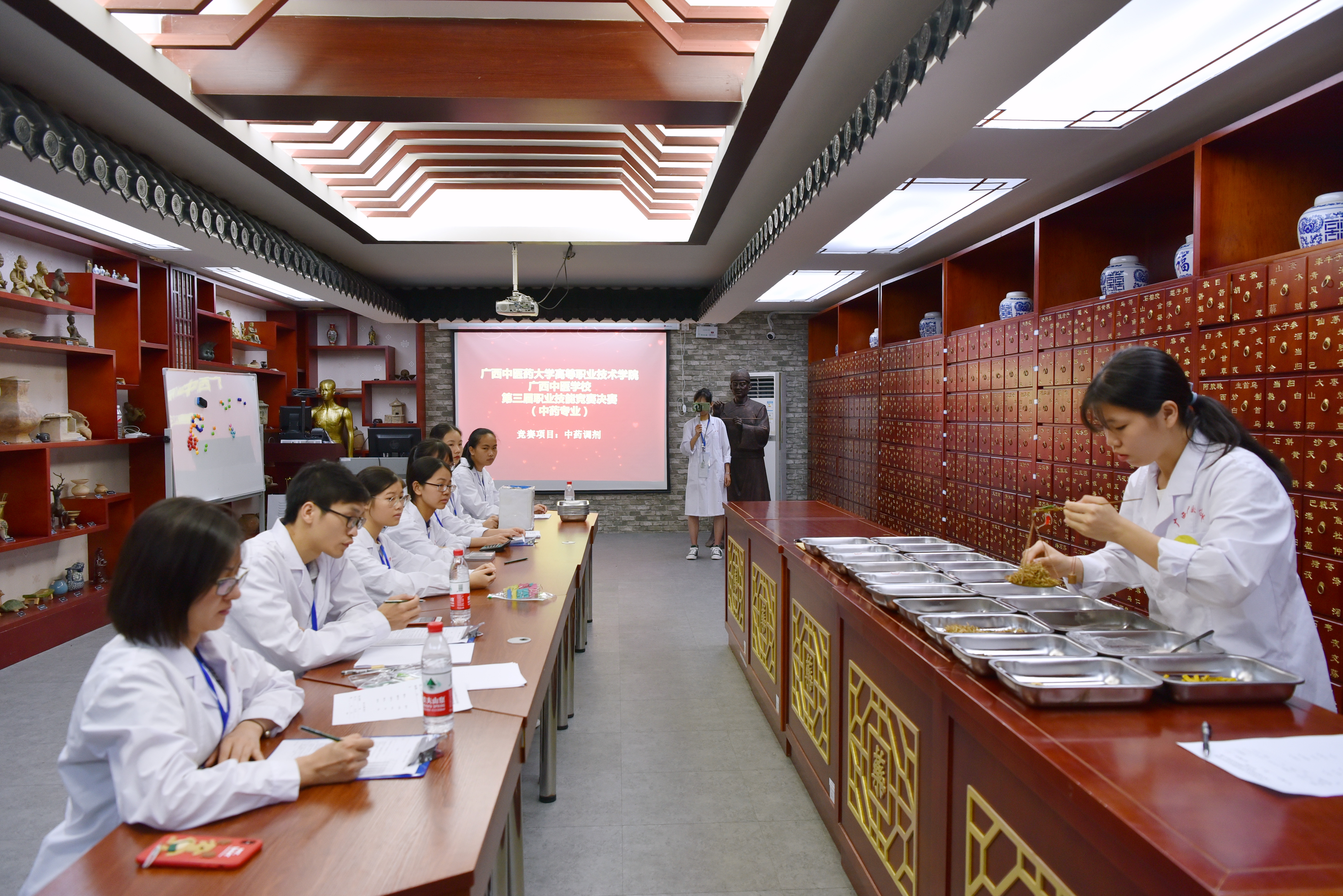 本次大赛,来自初赛选拔的护理、中医、药剂、中药、中医康复保健、康复技术、美容美体等7个中职专业学生及1个高职护理专业学生,共计251名参赛选手,分别在密闭式静脉输液技术、氧气筒给氧的氧气吸入术、鼻饲术、单人徒手心肺复苏术、罐法、点穴、推拿手法、床上良肢位摆放、面部基础护理操作法、化妆与造型、常见疾病的问病荐药、中药性状鉴别、药店收银POS系统的操作、中药调剂、医学基础知识竞答等竞赛项目中展开激烈角逐。