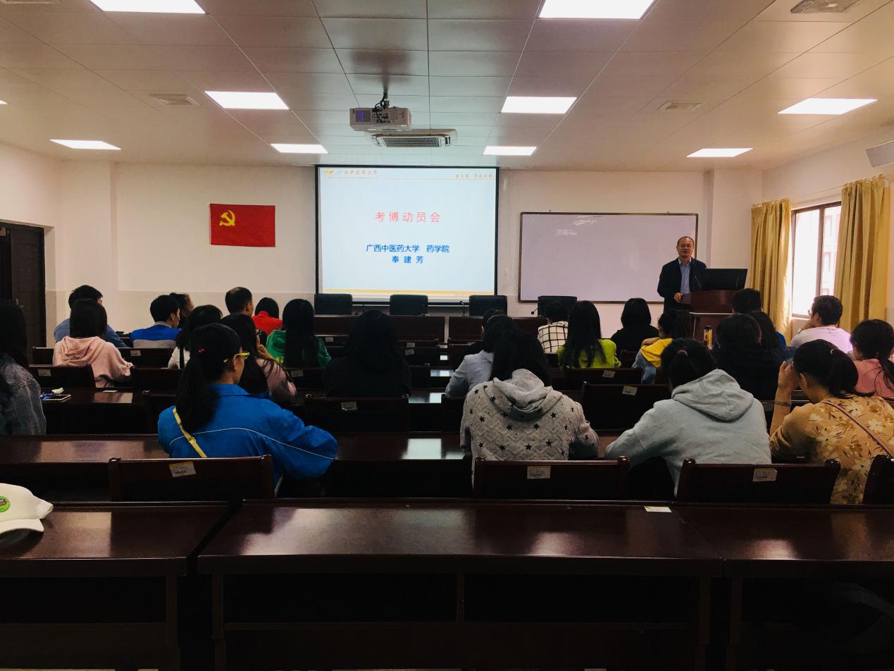 10月24日,药学院在达道楼A421会议室召开2017级研究生考博动员暨就业推进会。药学院院长奉建芳作动员讲话,副院长卢汝梅主持会议,药学院2017级全体研究生参加会议。