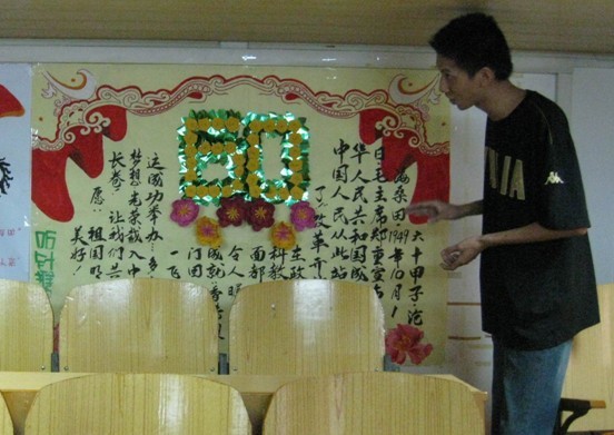 10月12号下午,第一临床医学院团总支、学生会举办“与祖国共喜庆,与健康共前行”为主题的海报评比活动,评委由第一临床医学院教学党总支专职副书记覃国智老师,教学部、学工部副主任林强老师,广西中医学院第一附属医院团委副书记肖易老师,团委李杭老师,年级主任秦燕老师以及团总支、学生会部分委员和各班级宣传委员共同组成。老师们在学生会及各班代表的陪同下,对各班级的海报逐一进行了评分、计分和点评。各班级团结一致设计迎评海报,发挥了最好水平。教室内洋溢着同学们的青春,海报上写满了同学们对祖国的热爱和抗击甲流的决心。最终06针推班摘得桂冠,06传统班荣获最佳创意奖。