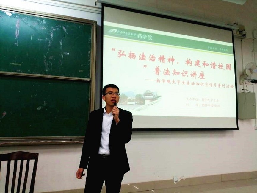 为进一步深入学习贯彻党的十九大和十九届四中全会关于“七五”普法规划目标任务精神,12月4至6日,药学院在仙葫校区教学楼开展了“国家宪法周”大学生普法知识系列讲座。本次系列讲座活动邀请凯南集团法务兼投资顾问黄成桂律师主讲,药学院各年级学生1000余人参加活动。学办主任凌勇威主持活动。