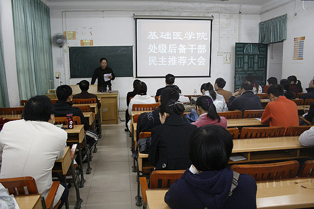 2009年12月8日下午,基础医学院在西二教室召开处级后备干部民主推荐大会。校党委组织部副部长、正处级组织员唐友明同志,基础医学院党政领导、全体中层干部、“双高”人员代表、各民主党派、无党派人士代表以及职工代表等出席会议。