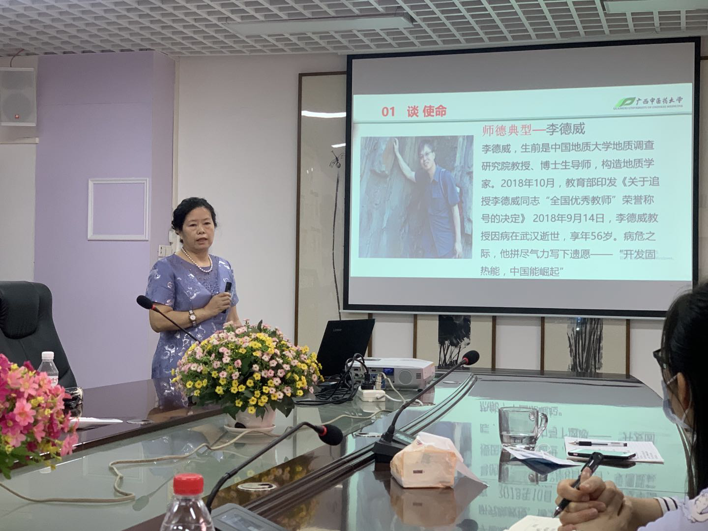 胡艳宁结合当今形势,系统阐述了加强师德建设的重要性,师德师风是评价教师队伍建设的第一标准。高校教师师德建设应以立德树人为基本任务,做到教书与育人统一,言传与身教统一,潜心问道与关注社会统一,学术自由和学术规范相统一。争做有理想信念,有道德情操,有扎实学识,有仁爱之心的“四有”好老师。