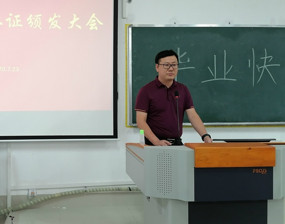 班主任代表蓝开宝老师向毕业生表达祝贺与祝福,希望同学们做新时代的坚定者、奋进者、搏击者,依靠刻苦学习创造更加美好的未来。