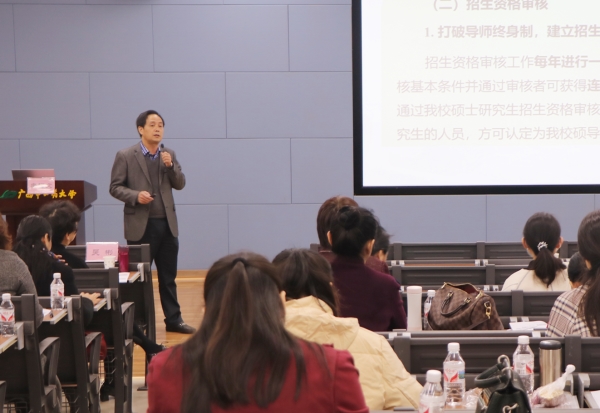 12月5日护理学院仙葫校区教学楼1-101成功举办线上线下相结合的护理硕士生导师培训班。学校党委副书记庞宇舟、护理学学科带头人杨连招、全体护理硕士研究生导师、护理学院全体教师、直属医院临床带教老师及各培养基地研究生教育管理人员共75人出席了会议。