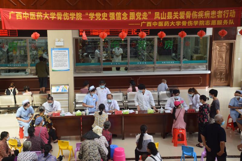 为深入贯彻“学党史 强信念 跟党走”的指示精神,7月22日至23日,骨伤学院以建党100周年党史学习教育为契机,由广西名中医周红海教授带领大学生、研究生三下乡团队,与特邀的瑞康医院脊柱外科潘汉升主任,第一附属医院内科王道刚副主任、王伟主治医生一行24人到河池市凤山县开展“学党史 强信念 跟党走”听红色历史、关爱骨伤疾病患者暑期社会实践、暨名中医工作室送医送药下基层活动。凤山县委书记薛海源,县长杨胜涛亲自接见周红海一行并给予活动大力支持。