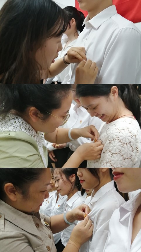 大会在庄严的《国际歌》声中拉开帷幕,首先学生第三党支部书记布银瑶致辞,对32名新党员加入中国共产党表达热烈祝贺。随后由各支部书记为新发展党员佩戴党员徽章,一枚枚闪闪发光的党徽,庄严佩戴在新党员胸口。正式党员赵飞翔同志带领新党员进行了入党宣誓。紧接着,新发展党员代表农振鼎、李德茂、罗火英进行发言。护理学院党委委员、学生第四党支部书记蓝红霞对新党员进行“新发展党员教育活动”。