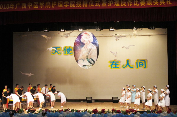 在这适逢春夏之交,万木葱绿的美好季节里,广西中医学院护理学院、广西中医学校于5月11、12日晚分别在广西交通职业技术学院礼堂、广西中医学校北湖校区礼堂隆重举行了庄严神圣的授帽仪式暨护理技术操作大赛颁奖典礼,这是护士文化节的重要活动之一,全校师生以自己的独特方式共同欢庆了今年“5.12”国际护士节的到来。