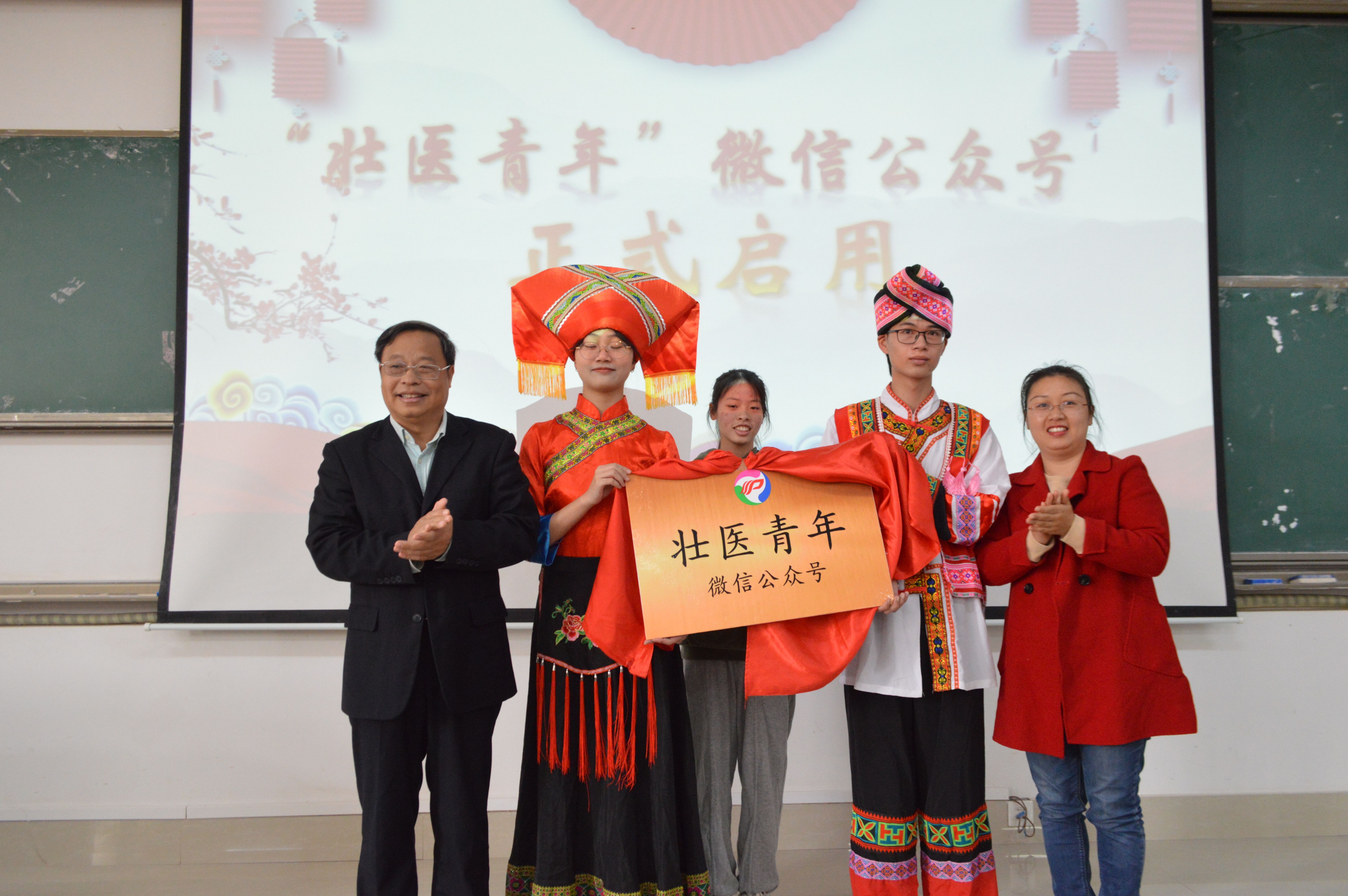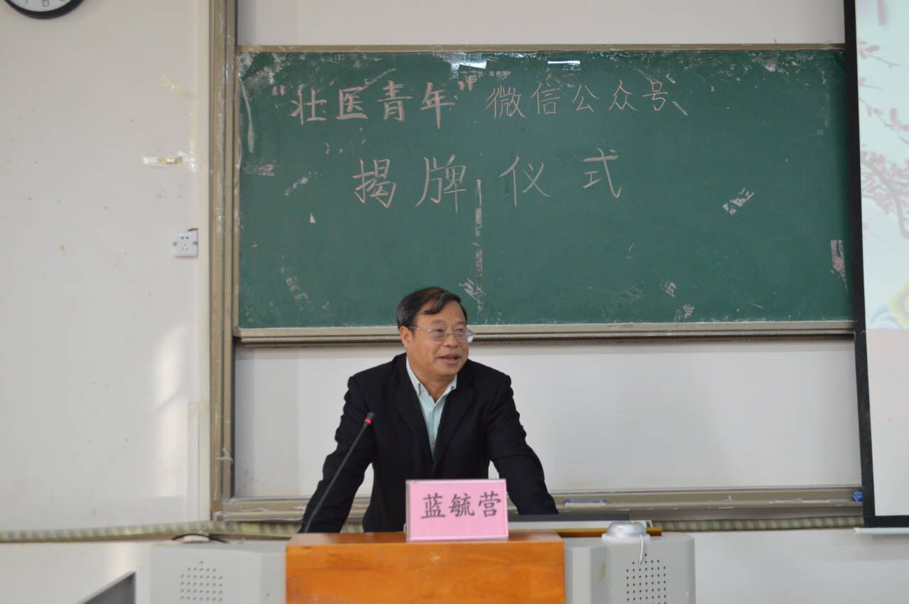 揭牌仪式中,蓝毓营代表壮医药学院领导班子向“壮医青年”微信公众号的建立表示热烈祝贺。他指出,“壮医青年”微信公众号的创立是我们壮医学子创新宣传阵地的新举措,他希望公众号负责人们能够严格把关公众号上发表的内容,坚守初心,传播正能量,共助壮医药学院发展长青。最后,蓝毓营与刘婷一起为公众号的正式启用进行揭牌。