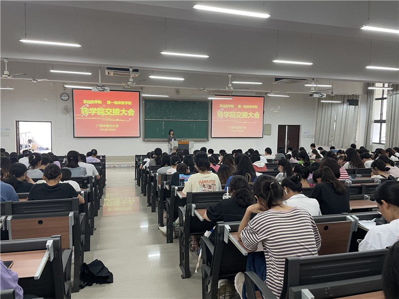 7月6日下午,第一临床医学院与基础医学院2022年学生转学院大会在鸭脖仙葫校区教学楼举行。第一临床医学院副书记、副院长钟远鸣教授、基础医学院党委副书记龙春莉、第一临床医学院教学党总支书记罗之瑜、两学院全体辅导员以及2020级702名学生参加了转学院大会。会议由基础医学院学工办主任杨丽琴主持。