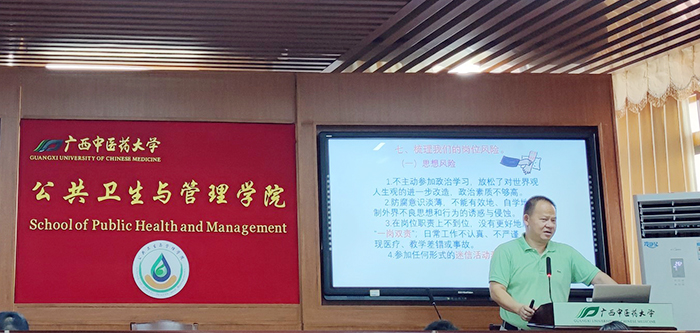 9月27日下午,公共卫生与管理学院开展教职工“廉洁从教”专题培训暨廉政警示教育活动。学院党总支书记李怀泽就“扎实推进‘清廉桂中医’建设”展开培训,并强调全院教职员工应牢记“为党育人、为国育才”的初心使命,明确“教书育人”的重要职责,以学生为中心,遵守“新时代高校教师职业行为十项准则”,不越“红七条”的师德禁行行为红线。对学院教职工在意识形态、教学、学术、学生管理等方面潜在的岗位风险进行了警示,学院党总支制定了有关防控措施,为稳步推进“清廉桂中医”建设打下了坚实的基础。