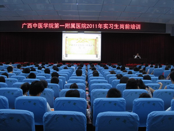 4月28至29日, 第一临床医学院2012届实习生进点岗前培训大会在医院学术会议厅顺利完成。参加培训的分别是广西中医学院06对外中医班、07中医班、07针推班、07口腔班、07中西结合班、07骨伤班、09针推高职班、09美容高职班、09美容高职订单班及广西中医学院赛恩斯新医药学院06对外中医班、07中医班、07针推班、07外科班、07骨伤班、07中西医结合班的即将在一附院进行实习的全体同学,人数共计336人,该批学生将于2011年5月4日开始实习。