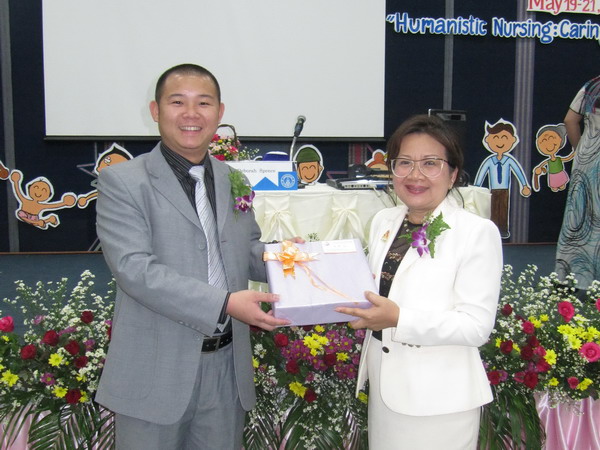 开幕式结束后,带队参会的玉锋老师及代表团的同学们与孔敬大学护理学院Dr.Earmporn院长进行亲切的交谈,表达了受邀的感谢之情,并送上我们师生从中国带来的礼物。接下来的三天时间里,学生代表团紧锣密鼓的参加了大会安排的每一项活动,在分会场的学术报告演讲活动中,来自07护英的吴桂贤、何丽丽、付蓉三位同学做了题为《家长对幼儿气管异物现场急救知识及技能掌握现状分析》的学术报告演讲,而来自08护英的梁业停、林青丽两位同学也不甘示弱,带来了《人性化护理在脑卒中后抑郁患者情志护理的情况分析》的学术报告演讲,演讲完毕时博得了阵阵掌声!