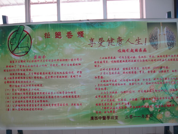每年的5月31日是世界无烟日。为响应卫生部、教育部最新规定,为创建无烟校园,倡导健康生活,让校园更加和谐美好。广西中医学院附设中医学校将2011年5月30日至6月3日一周定为“世界无烟日”宣传活动周。学校通过校园广播、横幅、电子屏幕、展板、主题班会、现场倡议签名活动等多种形式展开全方位宣传。
