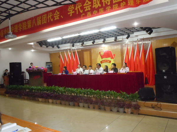 2011年10月27日19:00,共青团广西中医学院护理学院在大学生俱乐部隆重召开了第八次团代学代会。出席此次会议的领导老师有广西中医学院学工部部长学工处处长冼锦华老师、护理学院党委书记岑家铭老师、校团委副书记王春花老师、人文社科学分团委书记刘玲老师、壮医药学院分团委书记陈晓丽老师、研究生学院分团委书记杨思源老师、护理学院学工办主任许凤琼老师、护理学院分团委书记玉锋老师,以及护理学院学工办各位老师,此外,分团委学生会的正式代表、候选人以及各班代表共200多人也参加了本次大会。