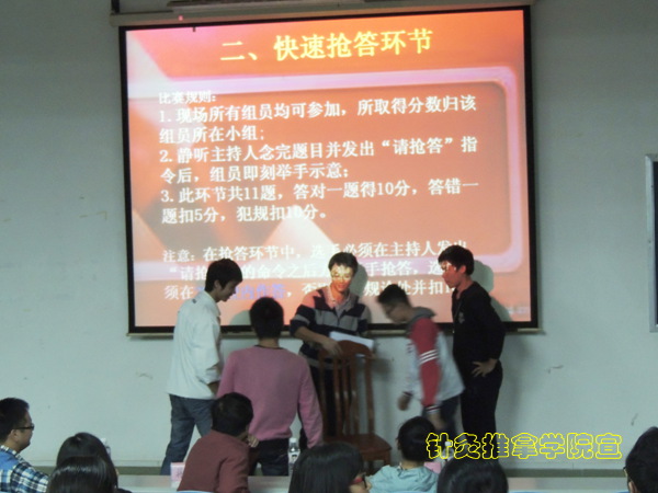 竞赛分为两个环节。首先进入的是必答题环节,在必答题上,每位同学青春扬溢,精神饱满,密切配合,答题干脆利落。随后的抢答题环节是以抢椅子的方式获得回答权,本环节要求各组队员更密切配合,尤其要求抢椅子队员全神贯注、反应灵敏,参赛队员的精彩抢答使得场下同学热情高涨,掌声和欢呼声阵阵袭来,比赛迈向了高潮。此次比赛评出了三个奖项,获奖情况为:10针本2组一等奖,11康复组二等奖,11针本和10本1组三等奖。