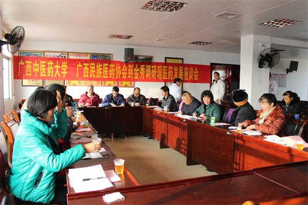 金秀县人民政府苏金萍副县长、卫生局吴桂珍局长、金秀瑶医医院梁琼平院长、金秀瑶医专家褚清纯、赵文有、赵春富、庞赵生与调研组召开了座谈会。座谈会上,苏金萍副县长对调研组专家诚挚地表达了金秀县希望大力发展瑶医药的愿望。李彤副院长代表调研组表达了到金秀县深调研的三大目的,即瑶医药教材编写、聘请金秀的民间瑶医瑶药专家和成立瑶医药学会。