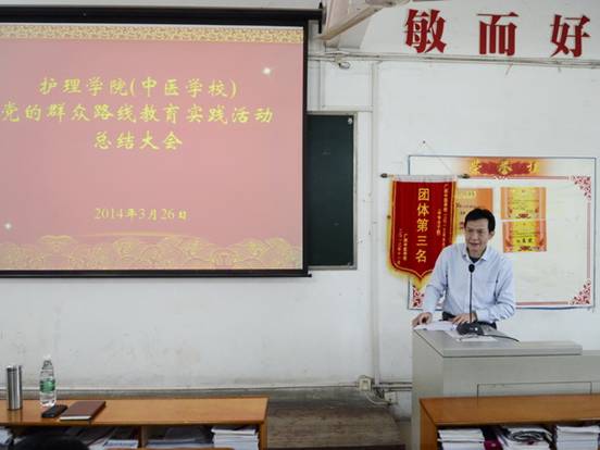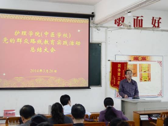 冼锦华书记在会上作护理学院党的群众路线教育实践活动总结发言。他说:护理学院教育实践活动从2013年7月开始启动,活动开展以来,在上级主管YABO鸭脖指导下,学院党委和全体党员干部高度重视,以为民务实清廉为主要内容,认真落实“照镜子、正衣冠、洗洗澡、治治病”的总要求,聚焦解决党员干部“四风”方面存在的突出问题,周密安排部署,扎实推进实施,较好地完成了教育实践活动各个环节的工作任务,在思想、实践、制度等方面取得了许多新变化和新成效。同时,也存在的一些问题:一是有些党员干部对理论学习不够,作风不够扎实;二是有些整改工作还不到位,一些制度还有待完善。我们要以此次教育实践活动为契机,进一步加强作风建设,增加为师生服务的意识,提高学院工作的整体水平。