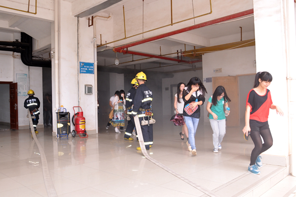 本次演练是贯彻落实《关于开展学校消防安全教育“六个一”活动的通知》精神,演练场景为课中遇到突发性火灾时的紧急撤离。演练前,赛院副院长杜惠娟出席了演练现场并作讲话,希望大家本着安全第一的原则,积极配合完成本次演练活动。随着消防支队青秀大队青秀中队消防应急疏散演练哨声响起,参演的2011级、2012级、2013级学生及辅导员,在后勤保卫处、教务处、学工处、物业公司等有关部门的引导下,按照火灾逃生的要求,用湿毛巾捂住口鼻,弯腰低行,有序地从4个消防楼道疏散撤离,疏散过程中没有出现堵塞、争先恐后、推撞踩踏的现象,全员均安全有序的撤离到了安全集结点。