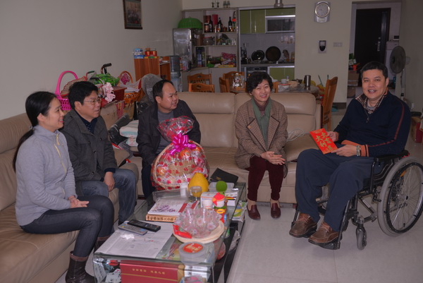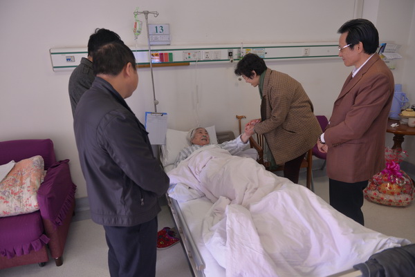 在新春佳节即将到来之际,广西中医学校校长吴彬、党委书记冼锦华、副校长黄勇在相关部门负责人的陪同下,于2015年1月8日走访慰问了鸭脖部分老校领导、退休职工及生病住院的教职工,感谢他们为学校的发展付出的辛勤努力和作出的贡献,并代表全校师生向他们致以新年的问候和新春的祝福。