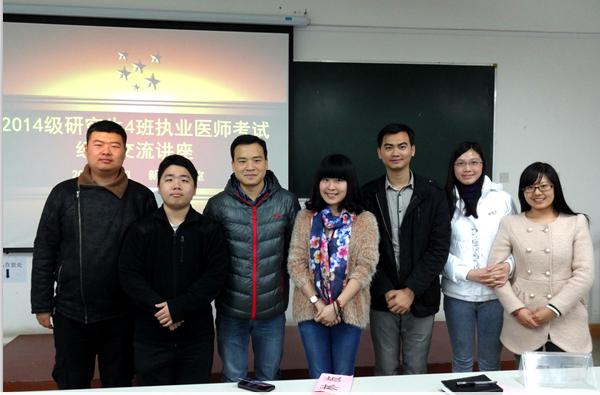 为了提高班级同学们对执业医师考试相关情况和形势的认识,更为深入地提升同学们各方面的复习效率和应试能力,提高考试通过率。2015年3月13日,由2014级研究生第四党支部主办,2014级研究生第四团支部承办的“执业医师考试经验交流会”在明秀校区新东二教室顺利举办,本次交流会不仅有2014级研究生四班同学的全程参与,更是吸引了众多其他班级的研究生同学慕名前来听讲。