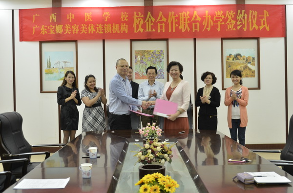 2015年4月23日上午10:30,广西中医学校与广东宝娜美容美体连锁机构校企合作联合办学签约仪式在东葛校区会议室举行。广西中医学校党委书记冼锦华、校长吴彬、党委副书记、纪委书记罗艺徽、副校长马秋平等校方代表,宝娜美业副总经理邓球英、人力资源总监张治国共同参加了本次签约仪式。仪式由吴彬校长主持。双方就合作的诸多问题进行了深入的洽谈并达成了共识。
