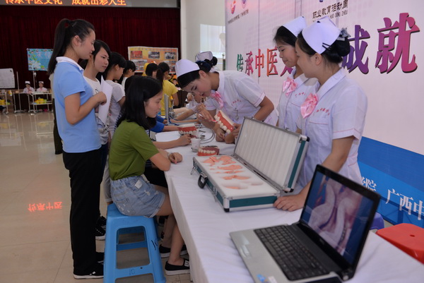 在广西中医学校北湖校区,学校开放了护 理、中医、中药、康复、针灸推拿等实训中心,由讲解员负责带队,按照计划线路进行参观,参观人员可以近距离感受学校在实训基地建设的成绩。此外,学校在大礼堂布置职业技能展示区、德育成果展示区等,以多种形式、全方位、多角度展示鸭脖办学成果。在职业技能展示区,来宾们可以体验拔火罐、艾灸、推拿等中医技 法技能,也可以了解口腔护理、生命的奥秘等医学知识,还可以学习心肺复苏等急救知识。学校岐黄协会、天使协会、弘毅醒狮团、动漫社等优秀社团的才艺展示也吸引大量来宾驻足欣赏。