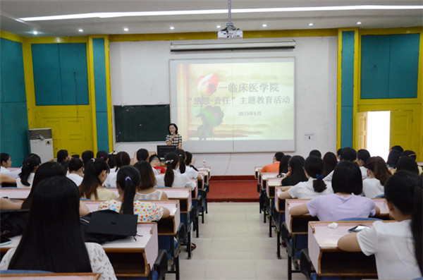 2015年6月18日上午,第一临床医学院在明秀校区西梯一教室开展毕业生党员“感恩·责任”主题教育活动。学院党委书记李敏智、教学部黄彬主任、全体辅导员及全体毕业生党员参加活动。活动由学院教学党总支书记罗之瑜主持。