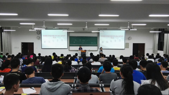 2015年10月15日,基础医学院在教学楼1-201开展了中医学专业认证知识考试,2014级中医学专业全体学生参与了此次考试。我院团委书记杨丽琴老师和2014级中医学专业辅导员张锐老师亲临现场主持考试。杨丽琴老师并就中医学专业认证迎评冲刺阶段做了动员讲话,中医学专业认证能促使学校各方面都得到全面的、整体的和综合的提升,而我们学生才是认证工作最终的受益者。因此我们学生要始终保持高度的责任感,积极主动参与到冲刺阶段中的认证工作,要和学校领导、老师齐心协力共同做好中医学专业认证工作。