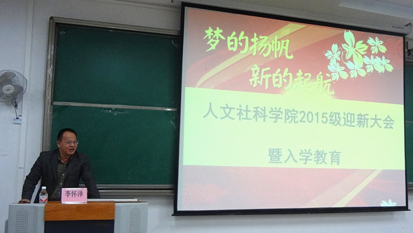 2015年9月,人文社科学院喜迎来自祖国四面八方的2015级新生154名,为了帮助大一新生尽快的适应和融入大学生活,稳定新生专业思想,加强新生的教育与管理,我院结合学校“关于认真做好2015级新生入学教育工作的通知”等相关文件要求和我院学生专业特点,于2015年9月29日晚,在仙葫校区教学楼1-201教室开展了2015迎新大会暨入学教育活动。