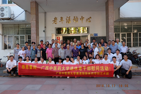 2015年10月17日,为迎我国传统敬老节日——“九九”重阳节,传承中华美德,弘扬敬老文化,赛恩斯新医药学院艺术团师生组成慰问团,赴学校明秀校区老年活动中心开展慰问活动,为离退休老干部献上一台的精彩的文艺演出,并发放慰问品,致以节日的问候。