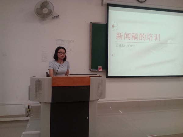 会议开始,王金兰老师细致、系统地给大家讲解新闻稿的基本要点,以及如何写好一篇新闻稿。为了让同学们更清晰的了解新闻写作的有关细节,王金兰老师还引用一些新闻报道来当例子进行讲解。王金兰老师号召学生要养成阅读的习惯,多读书,读好书,畅享悦读人生。王金兰老师也倡导学生多关注时事政治,多浏览与大学生息息相关的网站等,以提高新闻事实的获取能力和敏感度。在平时要多练习如何做笔记,做到能简明扼要的记下新闻要点。