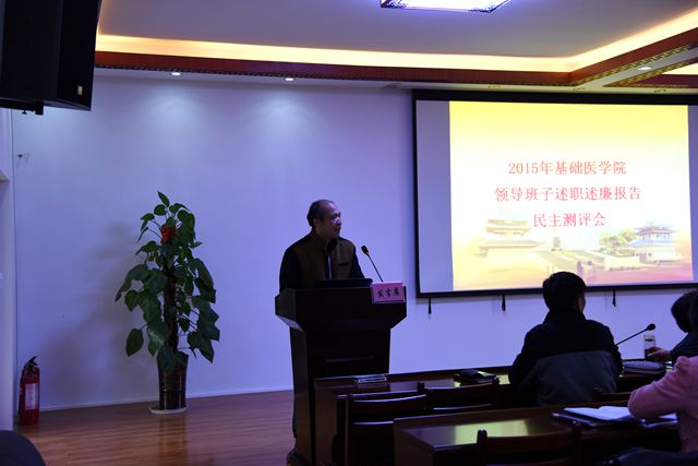 会上,基础医学院龚名师书记代表领导班子做了述职述廉报告,认真总结了2015年党政、教学、科研、学生工作各方面的工作情况,全面回顾了取得的成绩,认真分析存在的问题和不足,明确了今后工作努力的方向。随后,与会人员以无记名投票方式对领导班子和领导干部进行了民主测评。