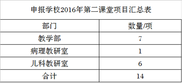 为鼓励教师参与学生第二课堂,充分调动教师参与学生第二课堂的积极性,根据学校印发的《YABO鸭脖关于填报2016年度第二课堂计划的通知》文件要求,积极宣传发动,组织各教研室、各科室开展大学生第二课堂项目申报工作。截止3月15日,第一临床医学院申报了包含卓越中医师人才培养计划、泛珠比赛相关培训考核等第二课堂项目共计14项,其中申报项目部门分布情况如下:教学部7项、病理教研室1项、儿科教研室6项。