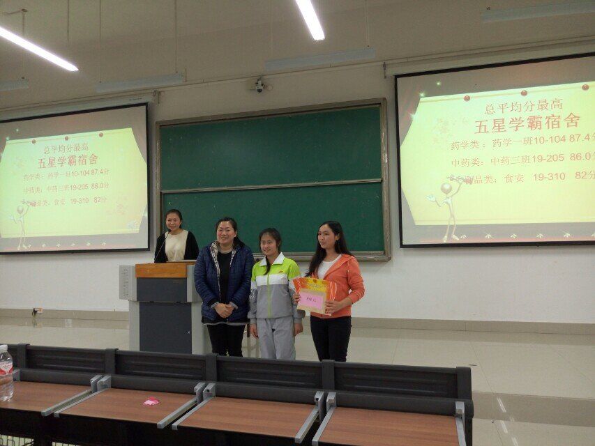 2016年3月29日,为进一步加强药学院宿舍学风建设,激发学生成才动力,加强宿舍同学间学习合作能力,奖励激励获得优秀成绩的同学,药学院在1-101举行了药学院2015级学霸宿舍评比颁奖仪式。药学院党委副书记李豫萍老师、药学院学生工作办公室主任凌勇威老师、药学院2015级年级辅导员管海钦老师出席了本次活动。