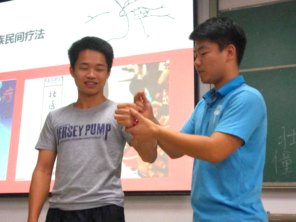 活动伊始,周霞老师请出两位身着壮族传统服饰的同学,她们抛出壮族传统绣球,寓意以绣球传递师生关系融洽、同学之间友好相处的情感,引得台下同学们呼声一片,活跃了现场气氛。其次,周霞老师从“壮族的族源”、“壮族的支系”、“壮族医药”以及“三月三习俗”等四个方面为同学们普及了壮族的相关知识,其中着重向同学们介绍壮族的传统服饰、壮族医药、道地药材、民间疗法以及壮族的生命观。周老师特意邀请我院的不同支系的壮族同学,上台讲述各自的壮语、着装等特性。介绍到壮族医药时,周老师展示了许多珍贵的壮药,并邀请了我院针推协会的理事上台讲解药线点灸的原理,现场给感冒的同学治疗。讲座过程中穿插着有奖问答和抛绣球环节,借此,加强同学们对壮族文化的好奇心以及活跃气氛。