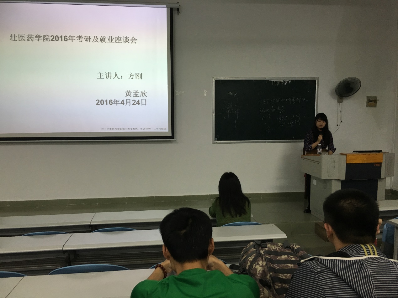 为了让我院学生了解和掌握考研相关知识,熟悉目前就业情况,壮医药学院于2016年4月24日晚在明秀校区教学楼成功举办了2016年考研及就业座谈会。壮医药学院2013级班主任方刚老师、学生办公室刘婷老师,2011级黄孟欣同学以及2012级和2013级全体同学参加了此次座谈会。会议由刘婷老师主持。